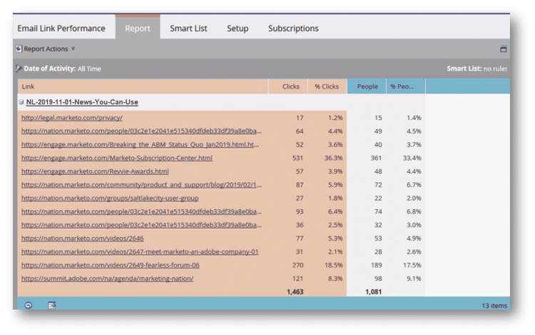 - A local Email Link Performance Report, which shows the Clicks, % Clicks and People, % People for each link in the associated email. This will show how many people click on each link in that specific email.
