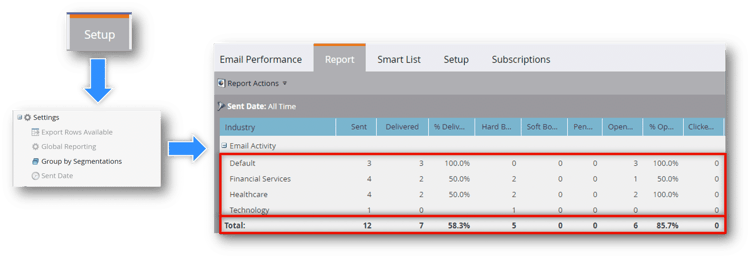 A flow showing how to add a segmentation to an Email Performance report by clicking the Setup tab and dragging the Group by Segmentations setting into the canvas.