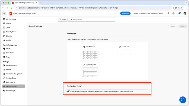 To enable or disable contextual search for all users, AEM administrators can do so by navigating to the General Settings and toggling the Contextual Search switch to the desired setting.