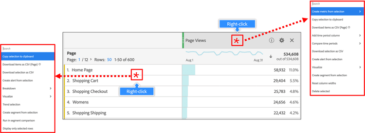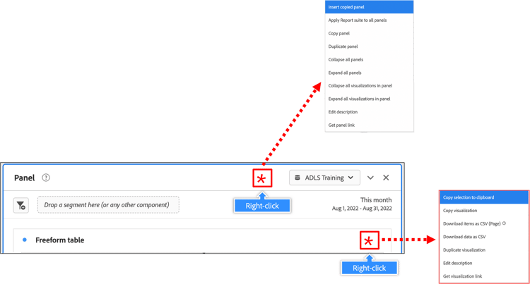 This step explains the features that the right click menus have in Analysis Workspace. Click on the images to zoom in or zoom out if needed.