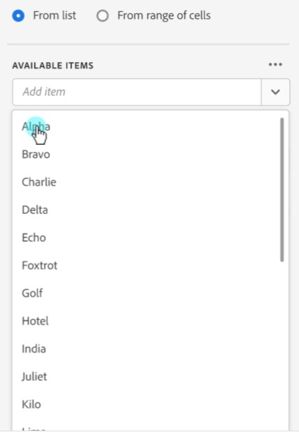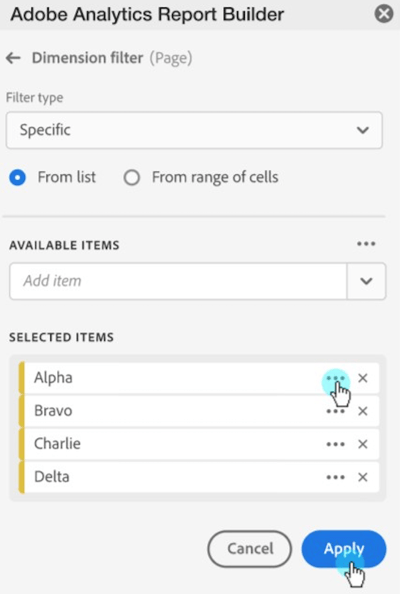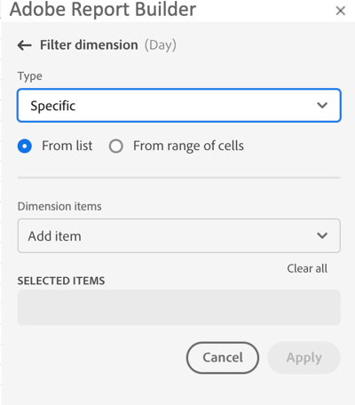 The Specific option allows you to create a fixed list of dimension items for each dimension. Use the Specific filtering type to specify the exact dimension items to include in your filter. You can select items from a list or from a range of cells.