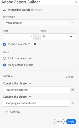 In Adobe Analytics, some dimensions collect a “no value” entry. This filter allows you to exclude these values from reports. For example, you can create a classification such as the Product Name classification based on the Product SKU key. If a specific product SKU has not been set up with its specific Product Name classification, its Product Name value is set to “no value”.