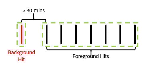 If the background hit occurs more than 30 minutes prior to any foreground hits, the background hit creates its own visit, for a total visit count of 2.