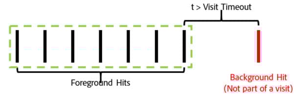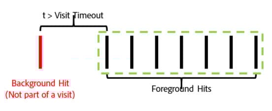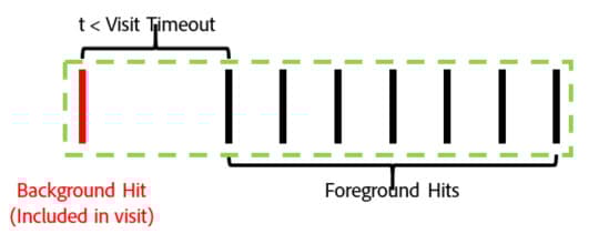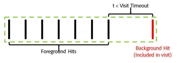 Conversely, if t is less than the virtual report suite’s configured visit timeout, the background hit is included as part of the visit as if it were a foreground hit (shown by the green outline):