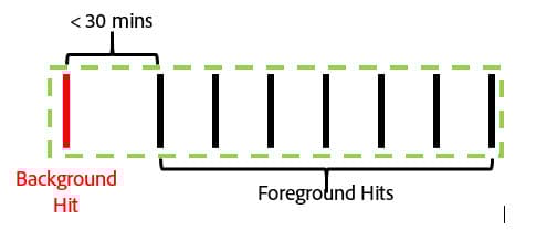 Example 3: In some circumstances, a background hit can cause what were two separate visits to be combined into a single visit. In the following scenario, a background hit is preceded and followed by a series of foreground hits: