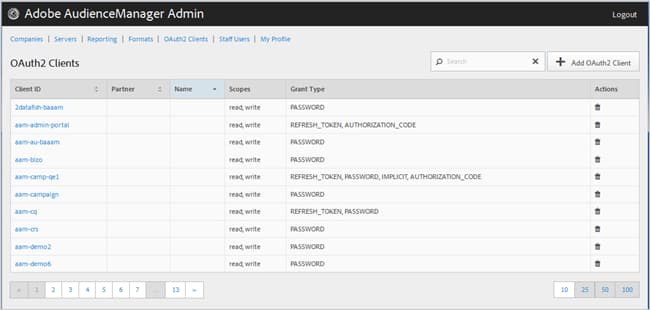Use the OAuth2 Clients page to view a list of OAuth2 clients in your Audience Manager configuration. You can edit or delete existing clients or create new clients, providing that you have the appropriate user roles assigned.