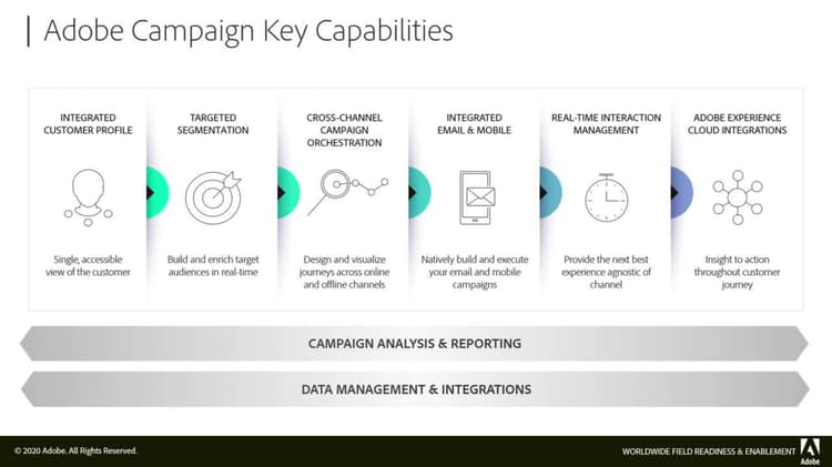 And finally, with a Adobe Campaign it provides a comprehensive application for the orchestration, launch and measurement of personalized cross-channel marketing campaigns that fuel meaningful customer experiences. Adobe Campaign provides a platform for designing cross-channel customer experiences, and provides an environment for visual campaign orchestration, real time interaction management and cross-channel execution.