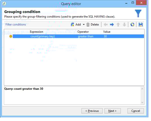 This data grouping window is only displayed if the Handle groupings (GROUP BY + HAVING) box was checked.