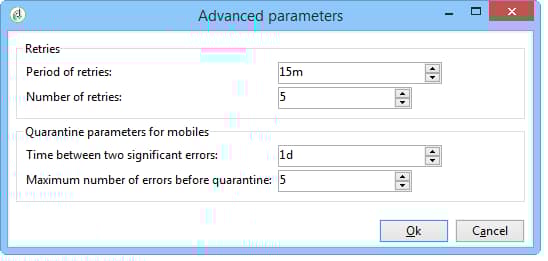 Information on retries is available in the Period of retries and Number of retries fields: When a mobile is unreachable, by default, the program will try again 5 times at intervals of at least 15 minutes (for the maximum delivery period). These values can be adapted to suit your needs.