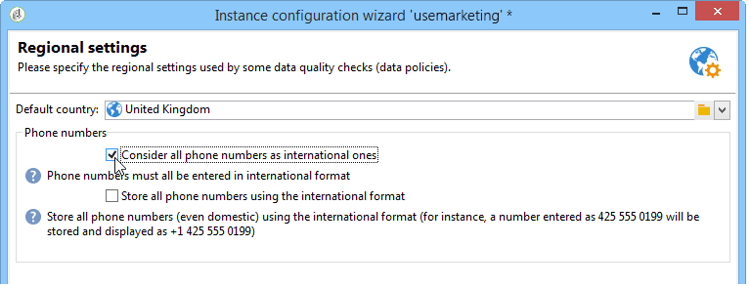 - Store all phone numbers using the international format : This option only concerns domestic phone numbers that are imported or edited. Define whether you wish to use a domestic format (such as 425 555 0150) or the international format (e.g. +1 425 555 0150)