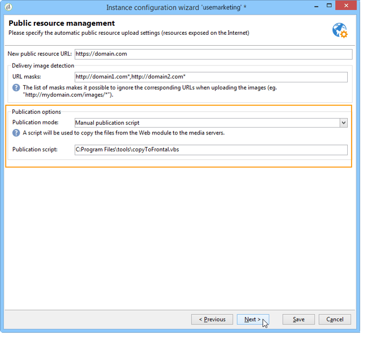 The lower section of the assistant enables you to select the publication options of public resources and images.