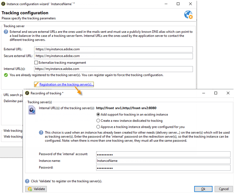 Internal URL(s) : URLs used only by the Adobe Campaign server to contact the tracking server(s) to collect logs and upload the URLs. It is not necessary to associate it with the instance.