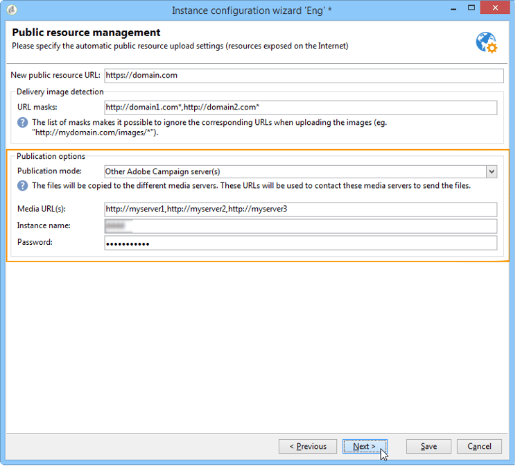 The parameters of the dedicated server(s) are given in the Media URL(s), Password and Instance name fields.