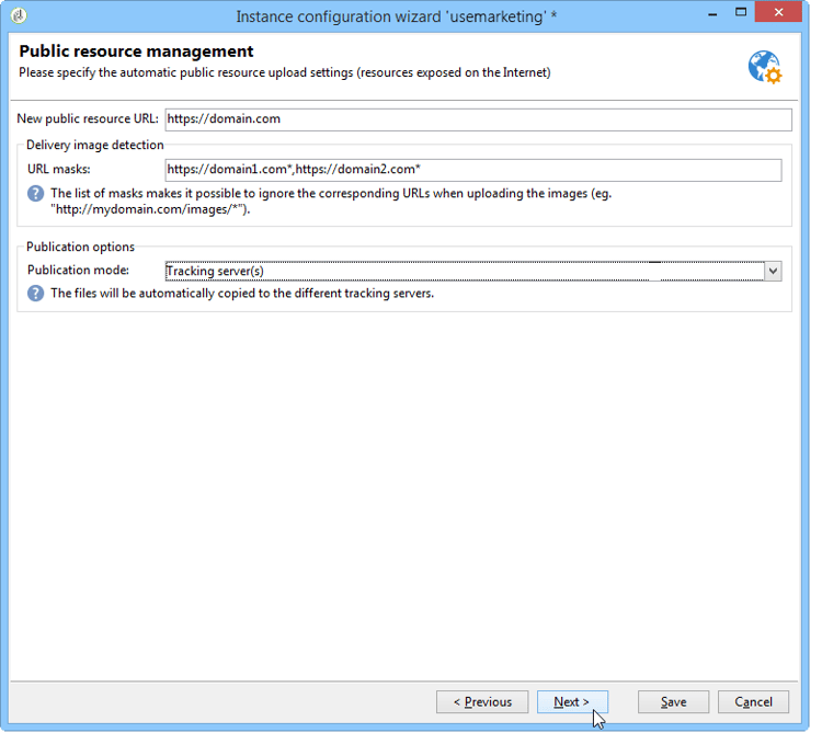This step is only offered when the Email channel and Tracking options are selected in the first page of the deployment wizard. Refer to General parameters.