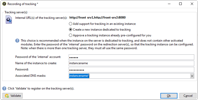 The next step lets you configure tracking for the instance. The instance must be declared and registered with the tracking server(s).