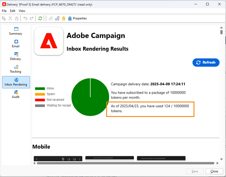 The number of remaining available tokens is displayed in the Inbox rendering report.