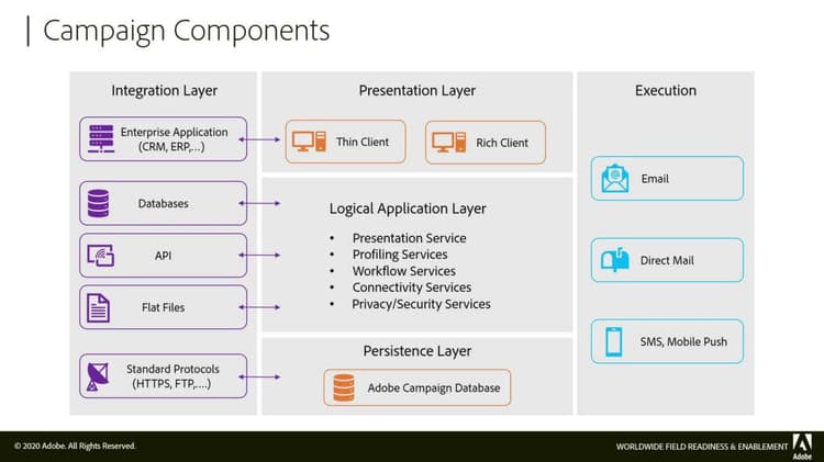 In this video, you’ll be provided a summary on how Campaign fits into the Adobe Digital Experience portfolio. You’ll also learn to identify the primary features and capabilities of Campaign. The Adobe Experience Cloud offers applications and services all sitting on top of Adobe Experience Platform. The applications offered in Experience Cloud are grouped under four main clouds. In Adobe’s Digital Experience Portfolio, Adobe Campaign, Experience Manager, Target, and Marketo Engage sit in the Marketing Cloud. The Marketing Cloud offers a single unified platform to deliver digital marketing experiences through four different applications. Adobe Experience Manager provides a content management solution. Adobe Target provides a personalization engine that lets you target and optimize with machine learning across mobile apps and the web. Adobe Marketo Engage provides lead management, B2B, and account-based marketing. And finally, with Adobe Campaign, we are provided a comprehensive application for the orchestration, launch, and measurement of personalized cross-channel marketing campaigns that fuel meaningful customer experiences. Adobe Campaign is a platform for designing cross-channel customer experiences and provides an environment for visual campaign orchestration, real-time interaction management, and cross-channel execution. Let’s have a look at the key capabilities of Campaign. The integrated customer profile offers a single, accessible view of the customer with a unified record of all interactions. Contact history, demographics, purchase data, derived data, and channel preferences are all contained in this customer profile. The profile continues to evolve as the customer’s interactions increase. It combines online and offline data, as well as web behavioral data. And these profile attributes can be used for one-to-one personalization and segmentation. In Campaign, we can create complex segmentation strategies for cross-channel campaigns with unlimited levels of segmentation. We can segment by customer attributes and then align offer messages and content with those segments, as well as track and analyze them through Campaign’s analysis and reporting capabilities. With cross-channel campaign orchestration, we can combine online and offline channels into a single workflow, create multi-step, multi-wave campaigns, and schedule and automate all campaign activities. We can design, build, and execute our mail and mobile campaigns natively within Campaign, design a one-to-one personalized email or SMS and push notifications, use Campaign’s full deliverability management capabilities, and finally, monitor and track deliveries across all channels. With Campaign’s real-time interaction management throughout the customer journey, we can determine the right offer for the right customer at the right time across channels while integrating outbound and inbound strategies. We can also manage cross-channel offers in a single repository and customize unique versions of offers across all channels. Adobe Experience Cloud integrations with Campaign provide insight that allow marketers to take action throughout the customer journey. Adobe Analytics can feed data into Campaign, enabling real-time targeting and cross-channel insights, and marketers can then send targeted campaigns for events such as cart abandonment. With Adobe Audience Manager, we can create and share audiences across the marketing cloud, enriching audiences for cross-channel strategies, applying lookalike modeling, and manage data governance regulations. Adobe Target allows us to present dynamic content at the time the emails open based on contextual clues such as data, time, location, and preferences of the customer. Adobe Experience Manager can be used for email authoring and content management. Additionally, Adobe Core Services share assets and audiences across the Adobe Experience Cloud. And finally, Campaign provides access to multiple data sources through data connections for CRM integration, as well as data collection activities that allow us to transfer and load data from external sources. Let’s have a look at the underlying architecture and components of Adobe Campaign captured in this diagram. We can see it consists of a presentation layer, an integration layer, a persistence layer, and a logical application layer. The presentation layer is comprised of the interfaces available to access the Campaign server. Campaign provides a built-in thin client as well as a rich client. The rich client is the main user interface of the application. It’s a native application to the Windows operating system, and it communicates with the Campaign application server solely with standard internet protocols such as SOAP and HTTP. This console provides great user-friendliness for productivity, uses very little bandwidth because of the use of a local cache, and is designed for easy deployment. The console can be deployed from an internet browser, can be updated automatically, and does not require any specific network configurations because it only generates HTTP and HTTPS traffic. The thin client provides access to a subset of Campaign’s functionality via a simple web browser using an HTML user interface. For example, the reporting module can be consulted directly from a browser. In addition to these two clients, the application server can also be accessed from an external application using the web services APIs exposed via the SOAP protocol. The integration layer provides external applications a method to integrate with Adobe Campaign. HTTP and HTTPS are used for tracking HTML opens, clicks, and redirects. It uses an SMTP server to deliver messages, and a POP3 server to receive all bounced messages. It supports file imports and exports of type CSV, TXT, or HTML, and also supports file transfers using SFTP and HTTP. Campaign’s databases are used as a persistence layer and contain almost all of the information and data managed by