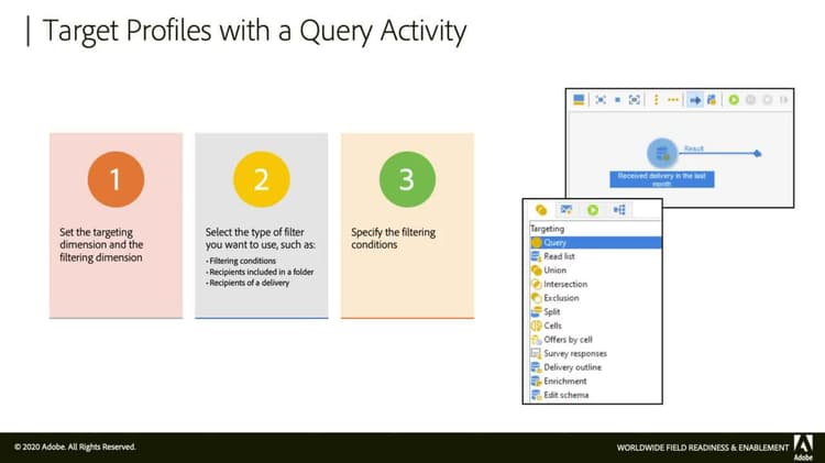 Welcome to Adobe Campaign! In this module, we will explain how to use campaign workflows and how to target profiles in a workflow. We will also learn about targeting and filtering dimensions, as well as how to create a targeting workflow and specify filtering conditions. Workflows are an extremely powerful tool in Campaign as they allow us to automate logical processes. There are two types of workflows, campaign workflows and technical workflows. Most of the activities for a marketing campaign occur in a campaign workflow. Technical workflows are used for operations or jobs scheduled for periodic execution on the server. For example, they let us carry out maintenance on the database and forward tracking information on deliveries. In this module, we will focus on the targeting capabilities for Campaign. Campaign workflows use queries to target profiles. To start, we need to set targeting dimensions and the filtering dimension for our query. Next, we need to select a filter. There are many different filters we can choose from that streamline our targeting. For example, we can target recipients that are included in a folder or recipients that have received a delivery. The available filter types depend on the targeting and filtering dimensions we configured earlier. Lastly, we specify the filtering conditions to identify the profiles we want to target. For example, if we select a recipient’s filter type within a folder, we need to select which folder. Now let’s talk a bit about targeting and filtering dimensions. The targeting dimension identifies the population type used by the operation and corresponds to a table in the database. When targeting for the purpose of sending deliveries, the most common targeting dimension is the recipient table. The recipient table is selected by default in the Query Activity tab. The filtering dimension is a table reference in the FROM argument of the SQL statement generated from the filtering conditions. The available filtering dimension depends on the target dimension we select. Only filtering dimensions compatible with the targeting dimension are made available. Let’s create a new targeting workflow with a variety of filtering conditions. In the Explorer view, navigate to Campaign Management and Campaigns. In the List view on the right, select New. Next, set the label. In this example, we’re going to keep the default start and end dates. Once completed, select OK. Next, let’s double click our campaign so we can see it in the full screen view and select the Edit tab. To avoid any conflicts, rename the internal name. Once completed, select Save. Next, let’s select the Targeting and Workflows tab, followed by selecting New in the top left corner to create a new workflow. In this example, we’ll name it Simple Targeting Workflows and select OK. Before we continue, select Refresh at the top. Then select Yes when prompted to save the changes. We can see our workflow has been updated here and created. Next, we need to update the properties. Select Properties and set an internal name, then select OK and Save. We may need to refresh again in order to update the workflow if it defaults back to the original. To the far left, we have the Activities side panel. We can drag and drop any of these activities onto the workflow. The name of the panel is displayed on the top just above Query. As we can see, selecting the different tabs, deliveries, flow control, and actions will populate the panel with different activities. Let’s select Targeting Activities, then select Query and drag it onto our workflow. Double click the Query activity icon, then select Edit Query. This is where we set the targeting and filtering dimensions. If we wanted to select a different filtering dimension, we can select the Filtering Dimensions dropdown and select a different dimension. For this exercise, we’re going to keep the recipients table for both the targeting and the filtering dimension. Below the filtering and targeting dimensions are our available filter types. With these options, we can quickly create filtering conditions. For example, we may want to target recipients included in a specific folder. Let’s select the recipients included in a folder filter, then select Next. Next, we need to select which recipient folder we want to target by selecting the plus icon to populate the folders. If we change our mind, we can select Previous to go back. We want to set up our own filtering conditions, so let’s select Filtering Conditions followed by selecting Next. The filter popover appears. Select the Express column and an Edit Expression icon appears. Select the Edit Expression icon and the Field to Select window appears. We’re going to target based on age, so double click on the Age attribute and change the operation to less than or equal to. Then in the Value column, set the value to 30. Once completed, we’re going to add another filtering condition by selecting the Add icon. Following the same steps as before, we’re going to select Age, set the operation to greater than or equal to, and set the value to 20. After setting our filtering conditions, we can preview our audience or target population by selecting the Preview tab at the bottom. We can also configure this list by right clicking and selecting Configure List. In the popover that appears, double click the Age column and select OK. Scrolling down, we can see that the age for our recipients is between 20 and 30. If we’re happy with the results, all we have to do is select Finish in the bottom right. We are redirected back to the Query page. Let’s rename the label of the query to Age Group 20-30 and select OK, followed by selecting Save in the top right corner. Once we’ve saved our edits, we can start the workflow by selecting the green Play icon. The Execution Status is displayed above the Workflow window in the top right. Our status is set to Paused and we can see the 287 results in the Workflow tab flash