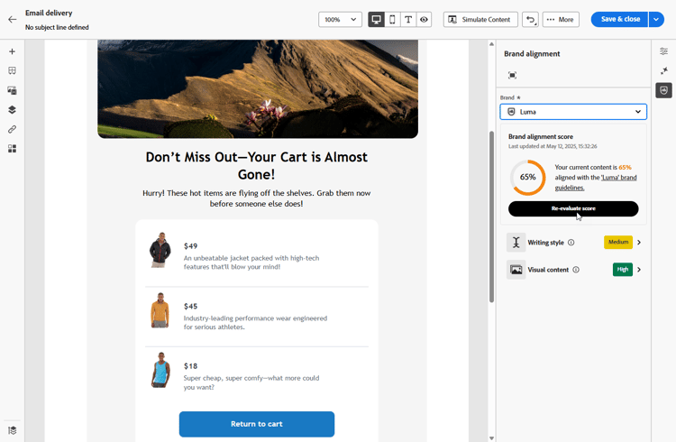Once your brand is set up and published, assess your brand alignment score directly within your email campaign to ensure your content aligns with your brand guidelines:
