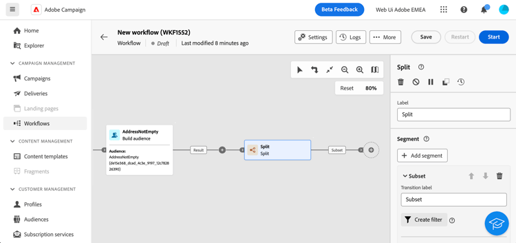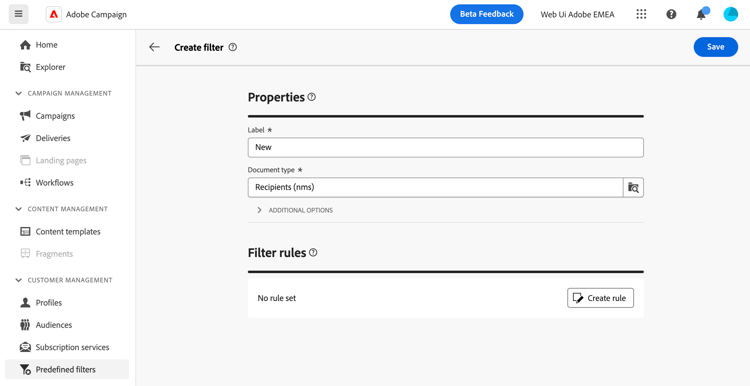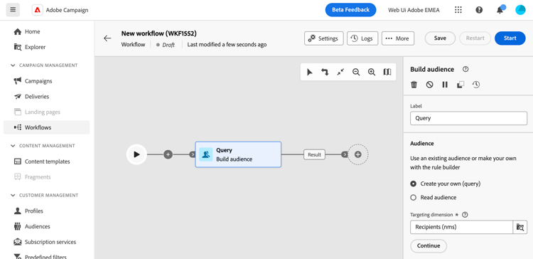 Adobe Campaign Web user interface features a query modeler that simplifies the process of filtering the database based on various criteria. It ensures full compatibility with the queries created in the client console, facilitating a seamless transition to the web user interface.