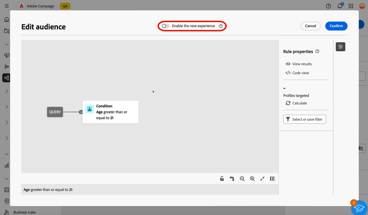 On the right-hand side, the Rule properties pane provides information on your query. It allows you to perform various operations to check the query and ensure it suits your needs. This pane displays when building a query to create an audience. Learn how to check and validate your query