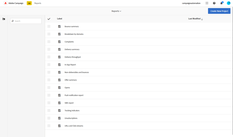 - Custom reports (identified in blue), which can be directly created by clicking the Create New Project button on the Reports home page.