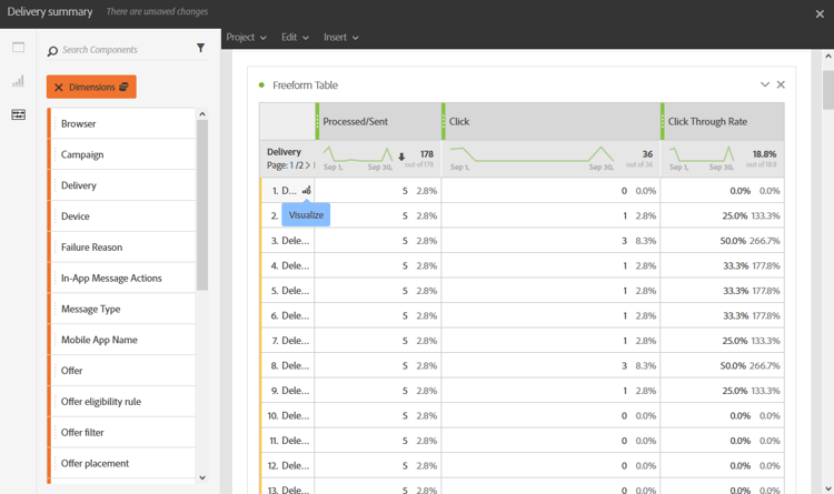 Freeform tables allow you to create a table to analyze your data using the different metrics and dimensions available in the Component table.