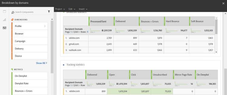 This report contains the performance data for each domain represented in the audience for an email delivery. If it is a campaign or program report, the performance data is available for multiple audiences. This data allows you to analyze the behavior of each domain in reaction to specific events. For example, link display, URL on denylist, etc.