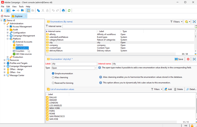 - A Closed enumeration has a fixed list of values which can only be modified from the Administration > Platform > Enumerations folder of the explorer.