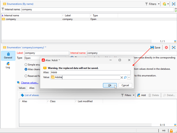 In enumeration fields, a value can be selected from the drop-down list or entered manually if not available in the list. Custom values can be added to the enumeration when the Open option is enabled. These values can later be standardized through alias cleansing, which automatically replaces variations with the correct term (for example, converting Adob to Adobe).