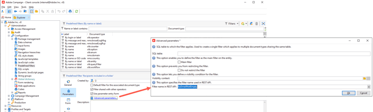 To use your filters in REST API payloads, you need to edit them in Campaign v8 and provide a name to use in your payloads. To do so access the filter’s additional parameters from the Parameters tab, and provide the desired name in the Filter name in REST API field.