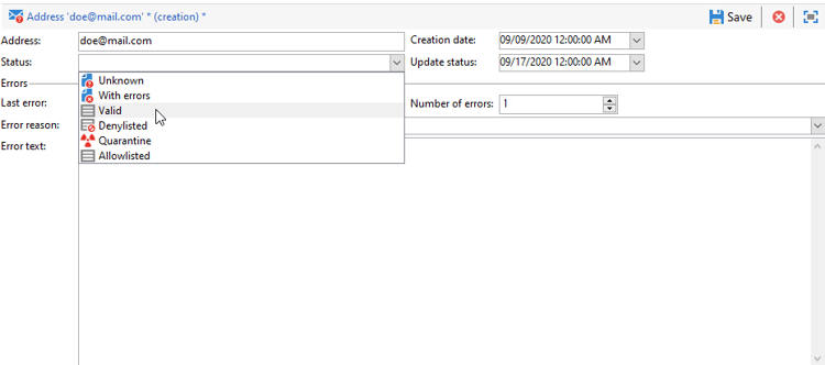 The error counter is reinitialized if the last significant error occurred more than 10 days ago. The address status then changes to Valid and it is deleted from the list of quarantines by the Database cleanup workflow. Learn more about technical workflows.