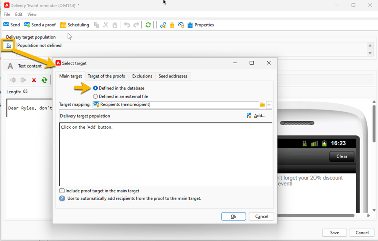 Because the audience is stored in Adobe Campaign database, in the Main target tab, choose Defined in the database option.