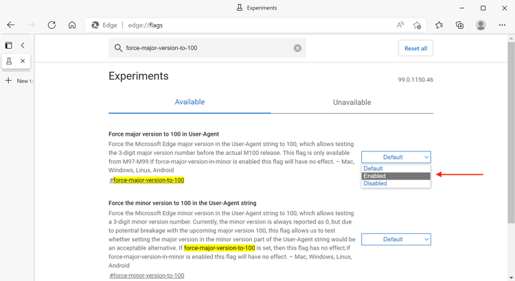 Starting with v97, site owners can emulate this version by enabling the experiment flag #force-major-version-to-100 in edge://flags.