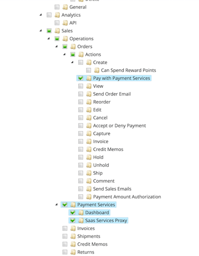 Pay with Payment Services—This resource ensures that when you create an order in the Admin, Payment Services credit cards are available as a payment method. If you select the Actions parent resource, this resource will also be selected.