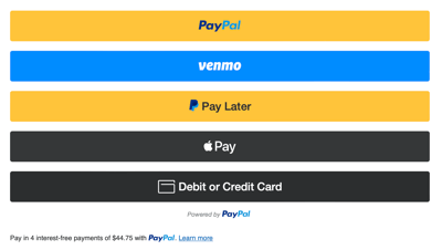 The PayPal payment buttons payment options provide a simple, fast, and secure checkout process for your customer.