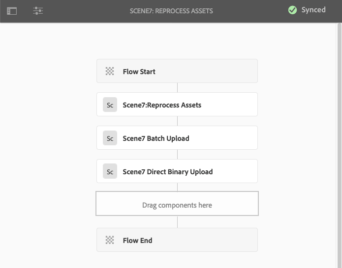 In the upper-right corner of the Dynamic Media Reprocess workflow model page, select Sync. When you see Synced, the workflow runtime model is successfully synchronized and ready to reprocess assets in a folder.