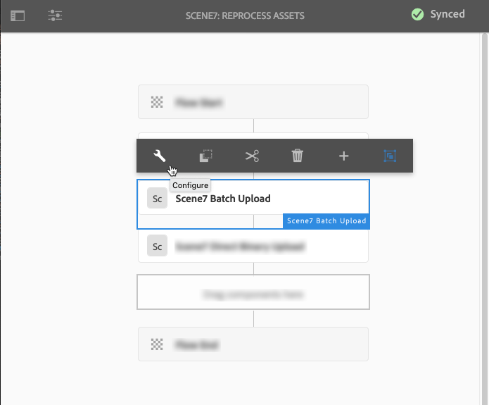 In the workflow, select the Scene7 Batch Upload component to open the toolbar, then select Configure on the toolbar.