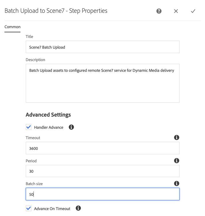 On the Batch Upload to Scene7 – Step Properties dialog box, set the following: