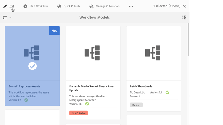On the tool bar, select Edit. A new browser tab opens the Dynamic Media Reprocess workflow model page.