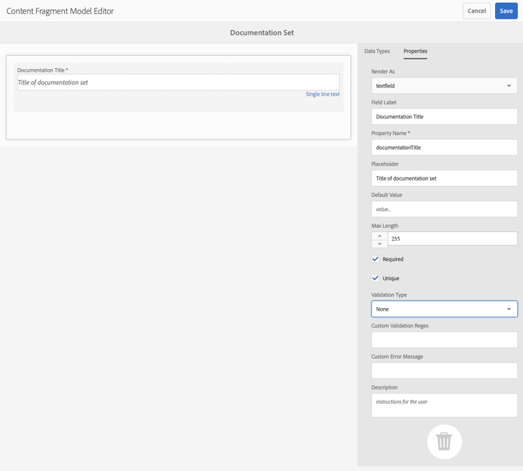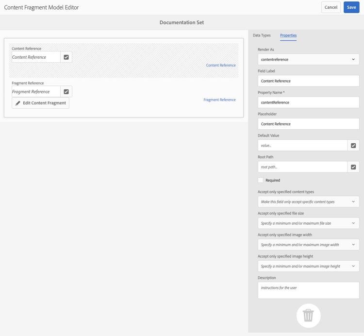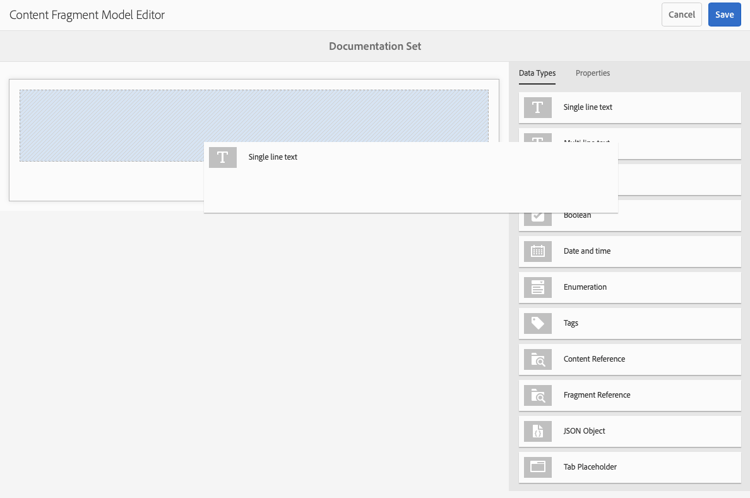 The content fragment model effectively defines the structure of the resulting content fragments using a selection of Data Types. Using the model editor you can add instances of the data types, then configure them to create the required fields: