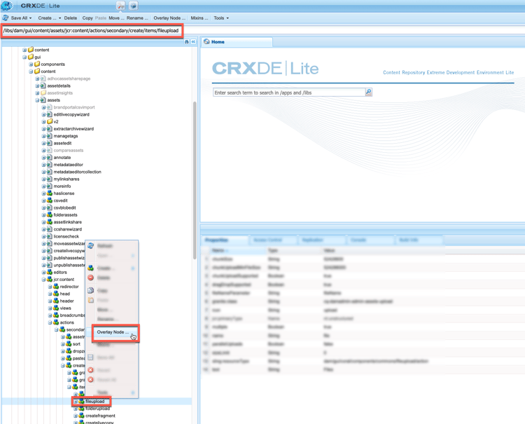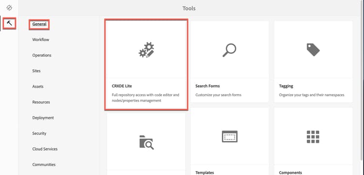 In Experience Manager, select the Experience Manager logo to access the global navigation console and navigate to Tools > General > CRXDE Lite.