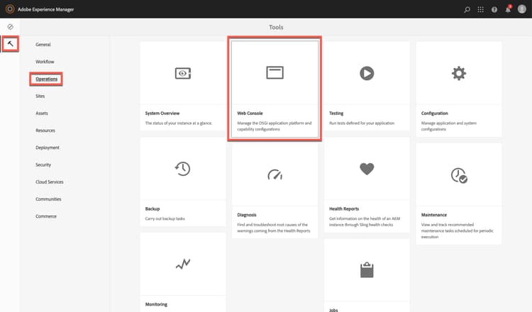 From Experience Manager, navigate to Tools > Operations > Web Console.