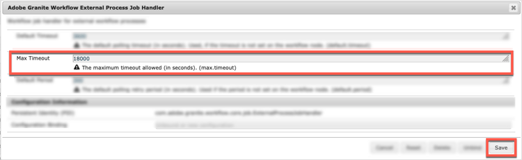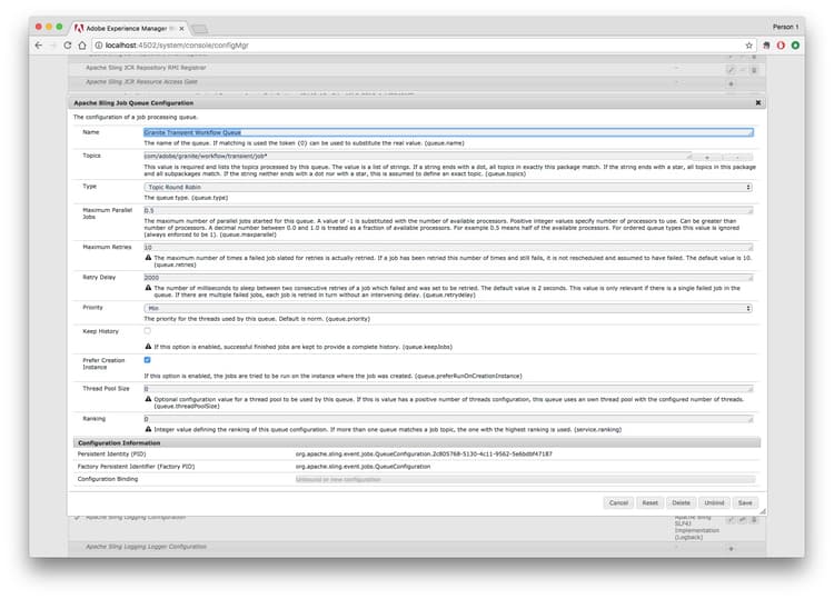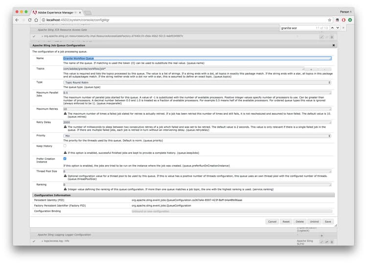 https://<server>/system/console/configMgrand search for Queue: Granite Workflow Queue.note note NOTE A text search is necessary instead of a direct URL because the OSGi PID is dynamically generated. -