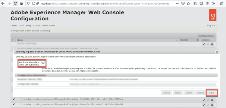 dam:scene7Domainanddam:scene7FileStatusin Upon Activation publish mode only. Go to the Sling Config Manager. Find the configuration forScene7ActivationJobConsumer Componentor create new one). Select the checkbox Replicate Metadata after Dynamic Media publishing, then select Save.