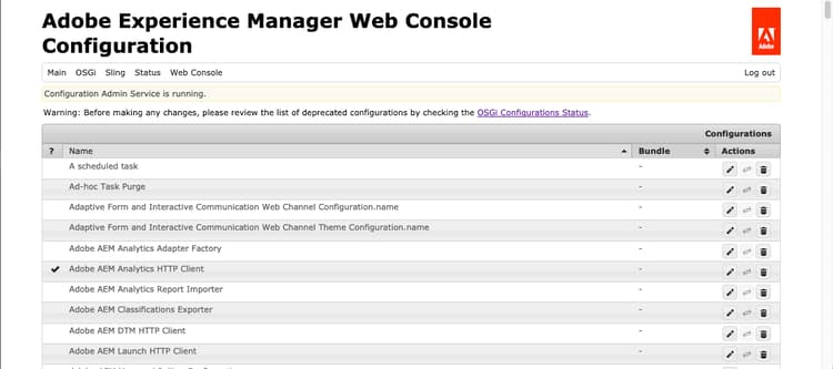 A new browser tab opens to the Adobe Experience Manager Web Console Configuration page.