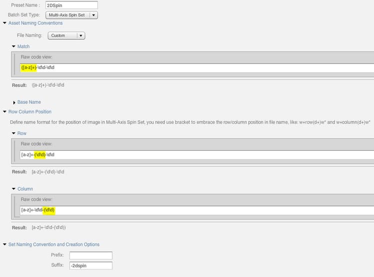 Grouping for the shared asset name part of the spin set is added to the Match field (as highlighted). The variable part of the asset name containing the row and column is added to the Row and Column fields, respectively.