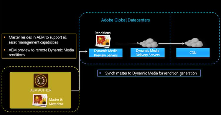 - After content is ready to be published and approved, it triggers the Dynamic Media service to push content out to delivery servers and cache content at the CDN (Content Delivery Network).