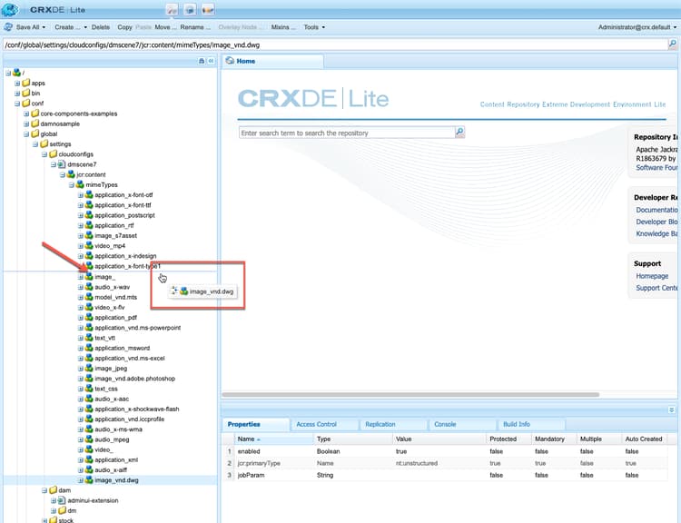 content > dam > <locate_your_asset> > jcr:content > metadata, and then in the table, locatedc:format.The following graphic is an example of an asset’s path to