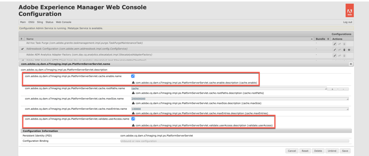 On the com.adobe.cq.dam.s7imaging.impl.ps.PlatformServerServlet.name page, select the check box for the following two settings: